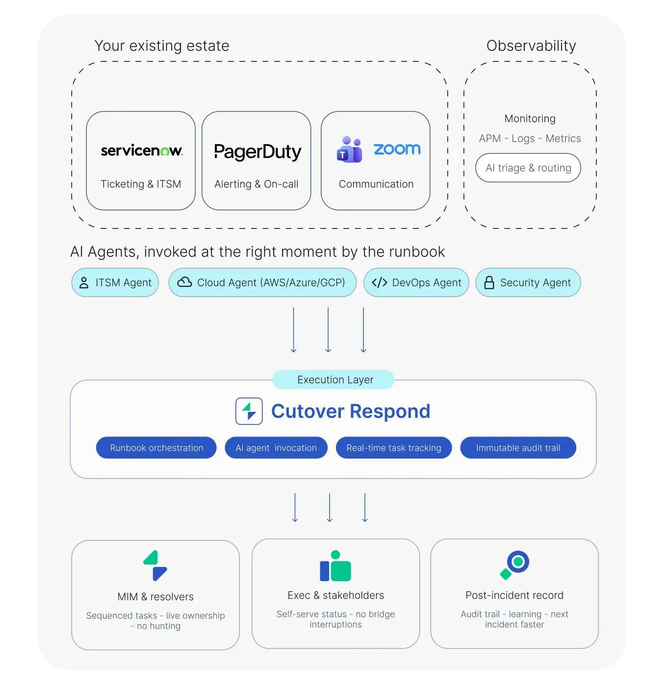Here’s how Cutover Respond combines with your existing estate and AI agents to give team members at every level what they need to successfully reduce MTTR: