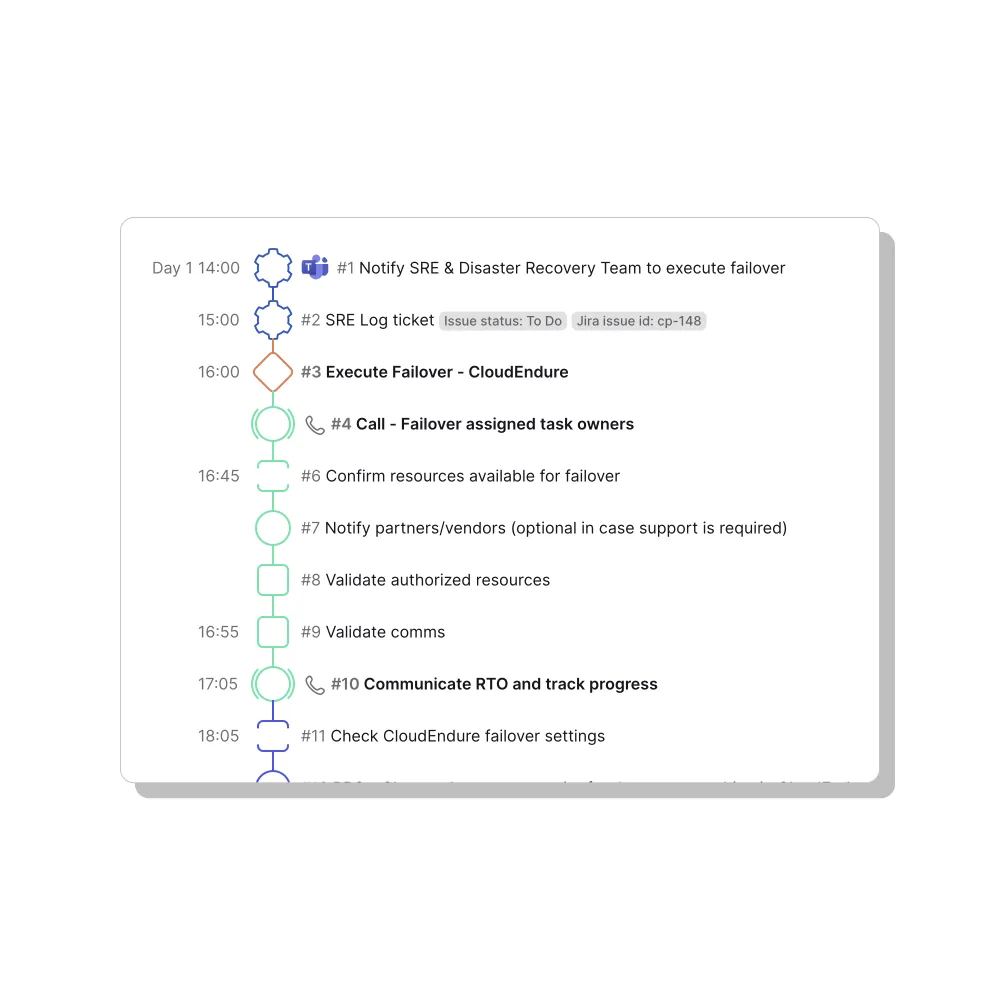 Use templated plans to ensure consistent responses to recovery scenarios, minimizing manual effort and the risk of human error. Turn chaotic incident response into a clear, accountable list of tasks for