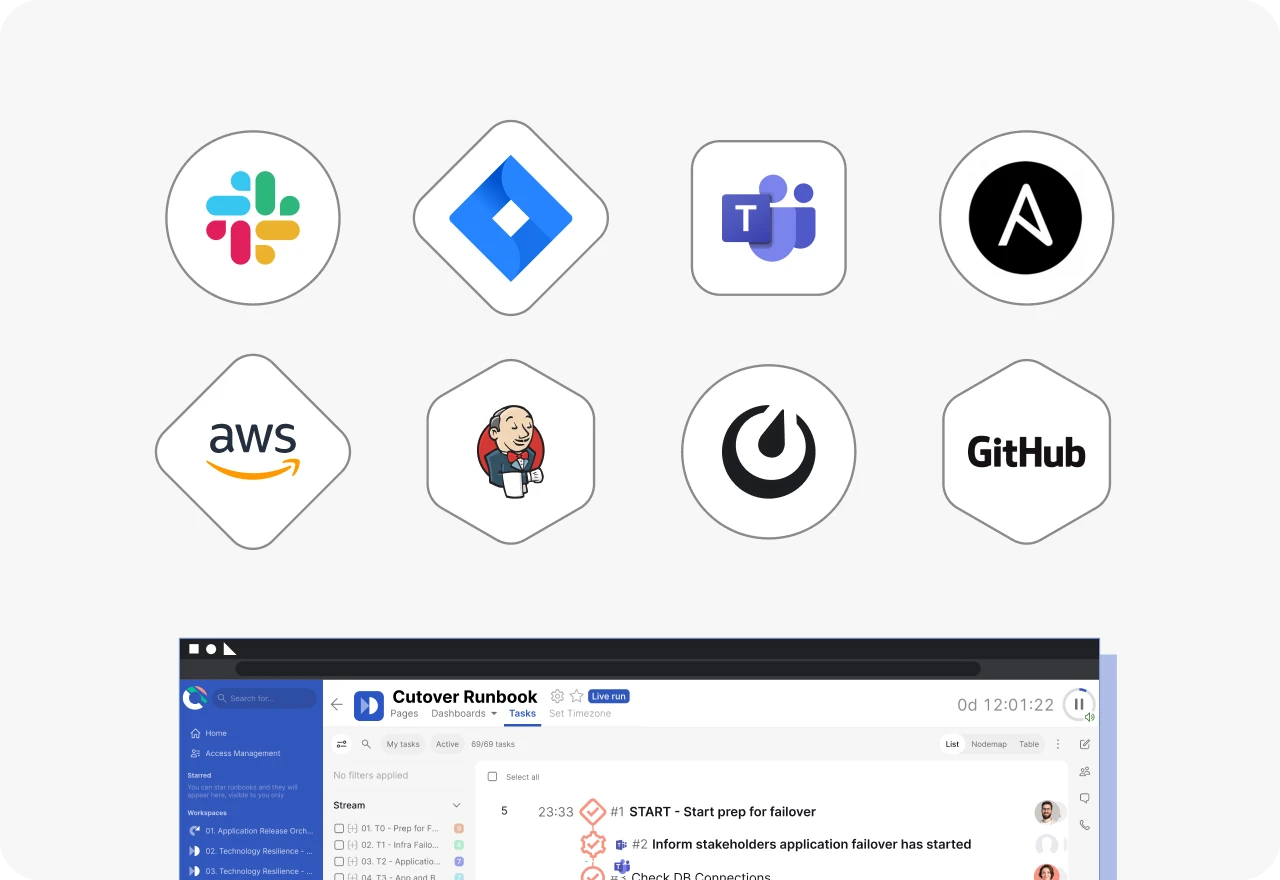 Cutover Release integrates with your existing infrastructure-as-code tools such as Ansible, Terraform, and other CI/CD tools, providing visibility and automation across the entire process.