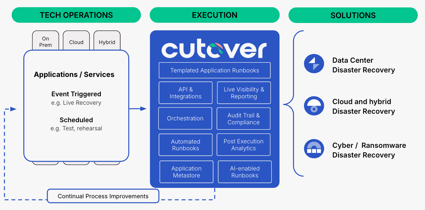 The Cutover Recover architecture methodology is designed to streamline and accelerate application recovery through a structured, automated, and intelligent approach.