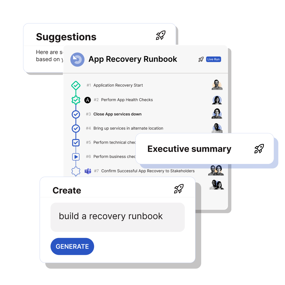 Finally, Cutover enables an AI-agent approach that goes well beyond static, pre-defined steps, allowing for dynamic adaptation to changing conditions and real-time insights with human oversight. Cutover AI agents empower the runbooks to learn from each recovery event, continuously refining their execution and minimizing human error. Cutover AI agents emphasize transparency and control, and align with the following principles: