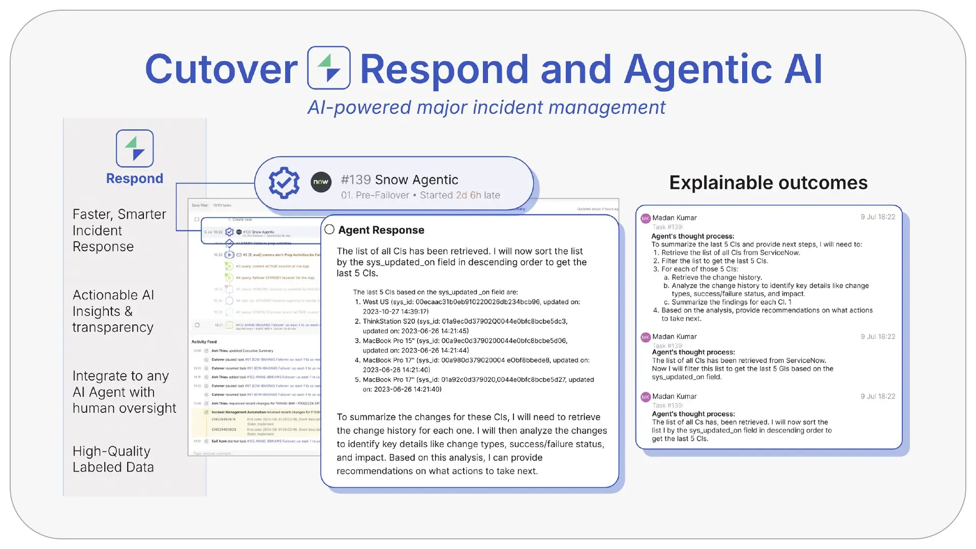 Cutover Respond offers a solution to streamline and enable automation and AI agents for the entire incident management lifecycle.Through automated workflows, a task-based model, AI agent integration, centralized communication, and real-time visibility, Respond facilitates a faster and more coordinated approach, ultimately reducing MTTR.