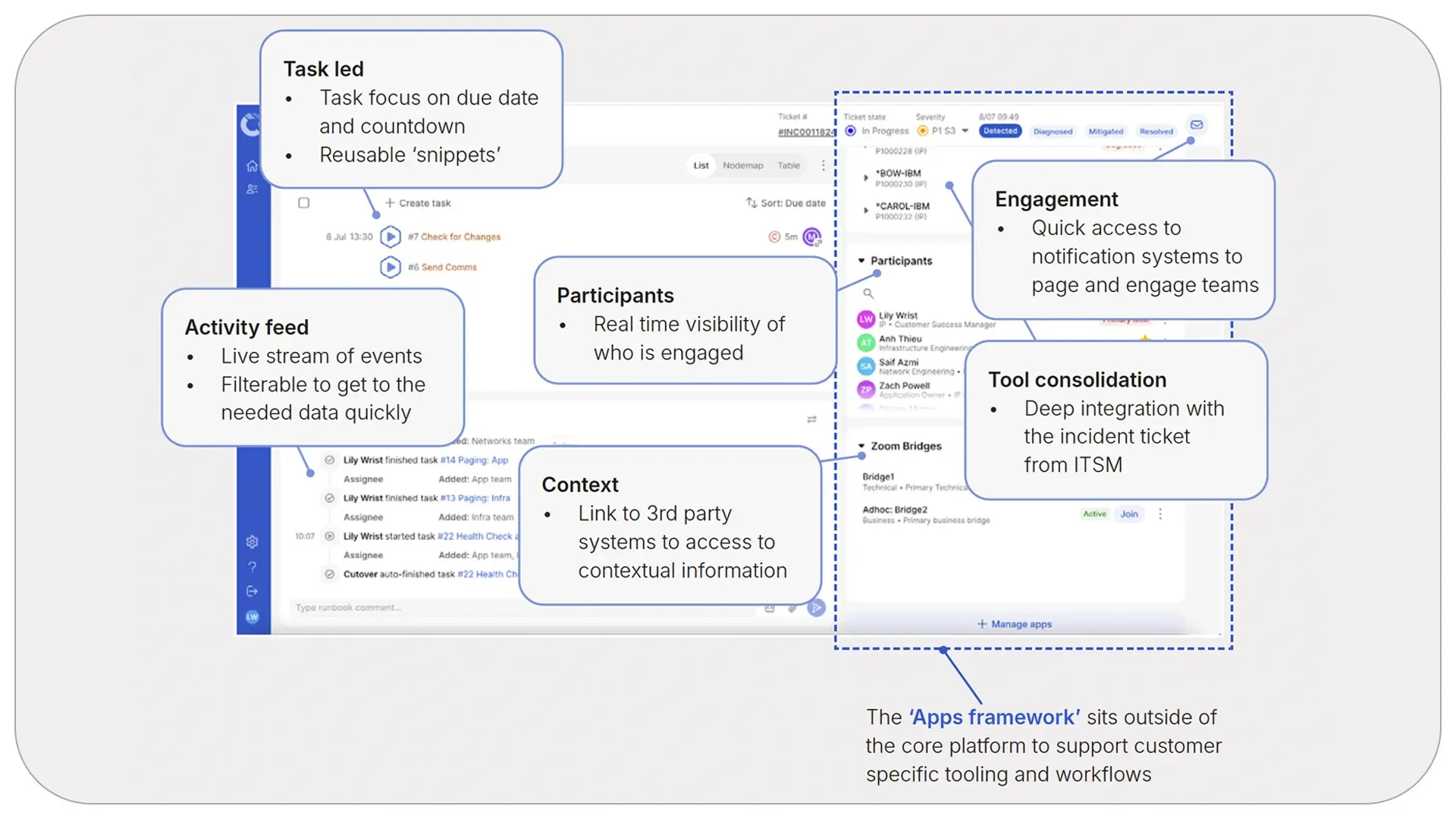 - Centralized command and control: One of the biggest challenges that Major Incident Managers face is having to pivot between different tools during an incident response, costing valuable time and creating greater stress and risk. Having a centralized solution that unifies these tools, for example by integrating with your IT service management (ITSM) platform, avoids the need to constantly switch between them and will make incident response faster, more efficient, and more effective.