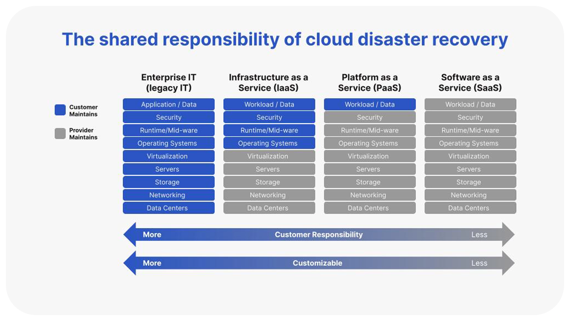 While your workloads are in the cloud and your cloud provider is managing and protecting the infrastructure, you’re not off the hook. With Infrastructure as a service (IaaS), you are responsible for the workloads, security, middleware, and guest operating systems. This includes outlining recovery time objectives (RTOs), testing and tracking recovery time actuals (RTAs) and the ownership of the overall availability and recovery.